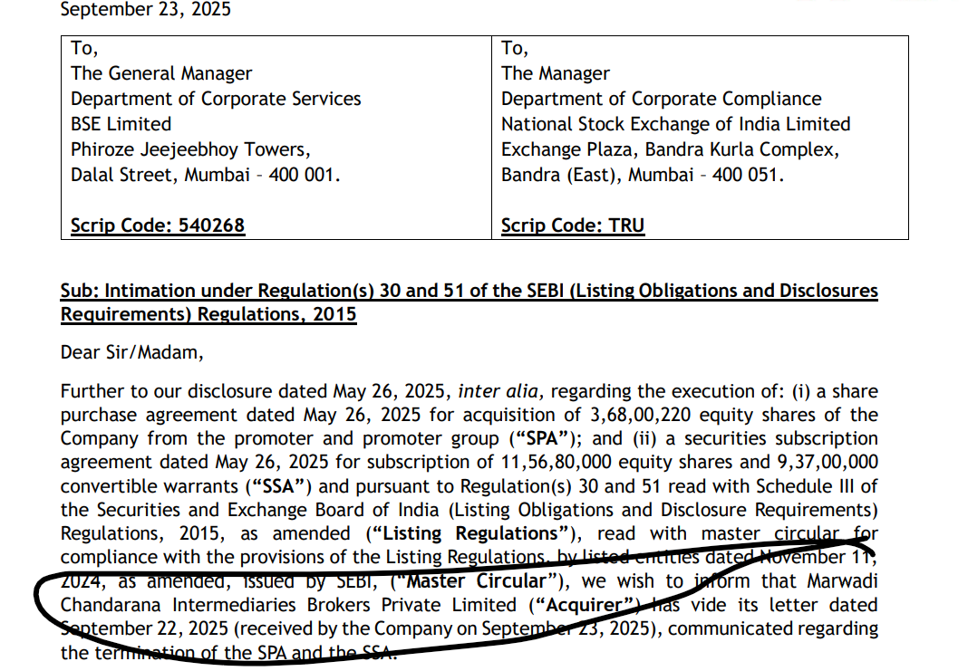 However, on 23 September 2025, TruCap disclosed that Marwadi has terminated both agreements, effectively withdrawing from the deal. This cancellation removes a key source of anticipated capital support, leaving TruCap’s financial position uncertain despite earlier repayments.